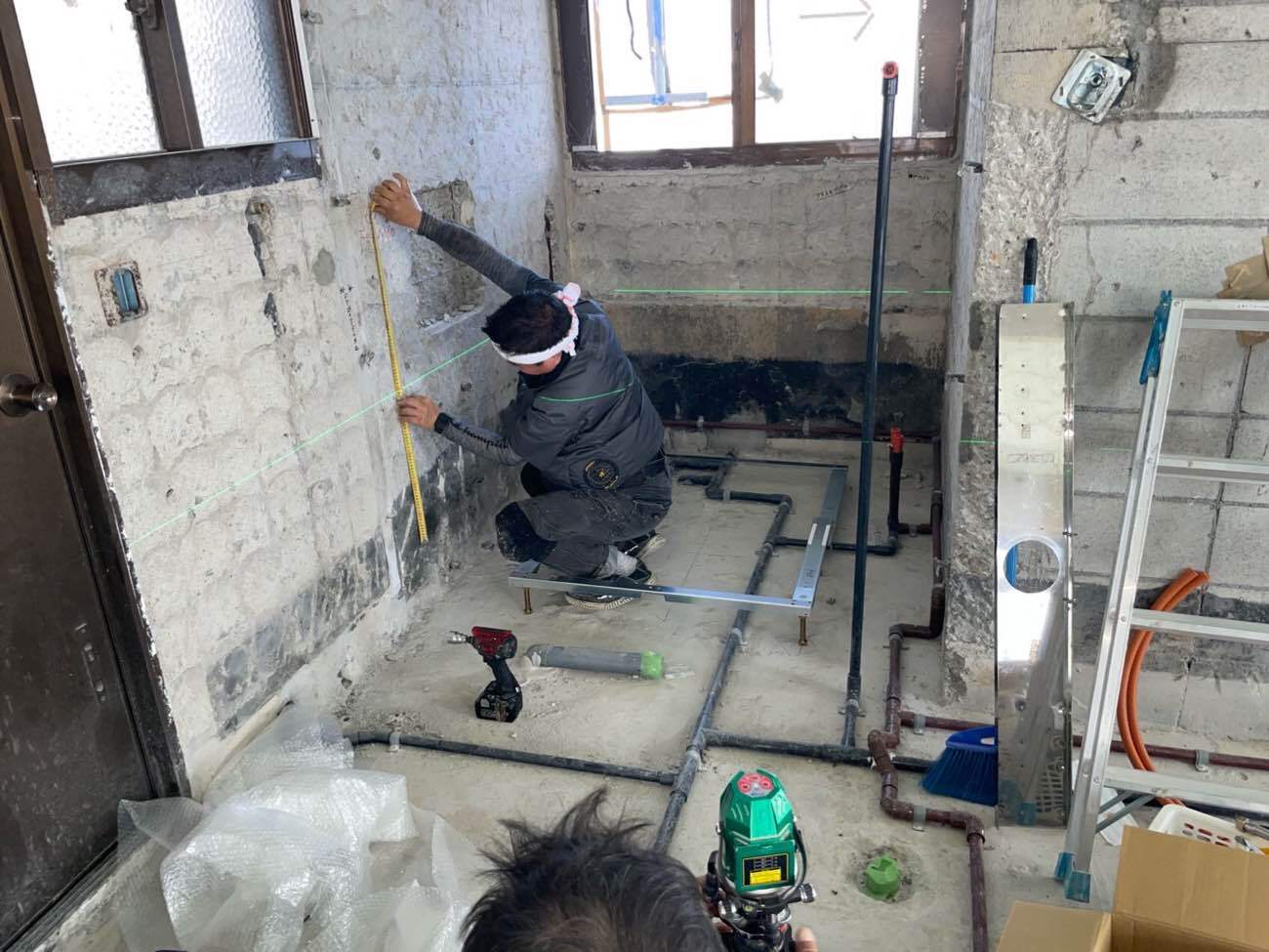 水道の配管や電気配線の工事も進み、いち早くUB(ユニットバス)の設置も完了しました🛁(写真はUB設置の様子)