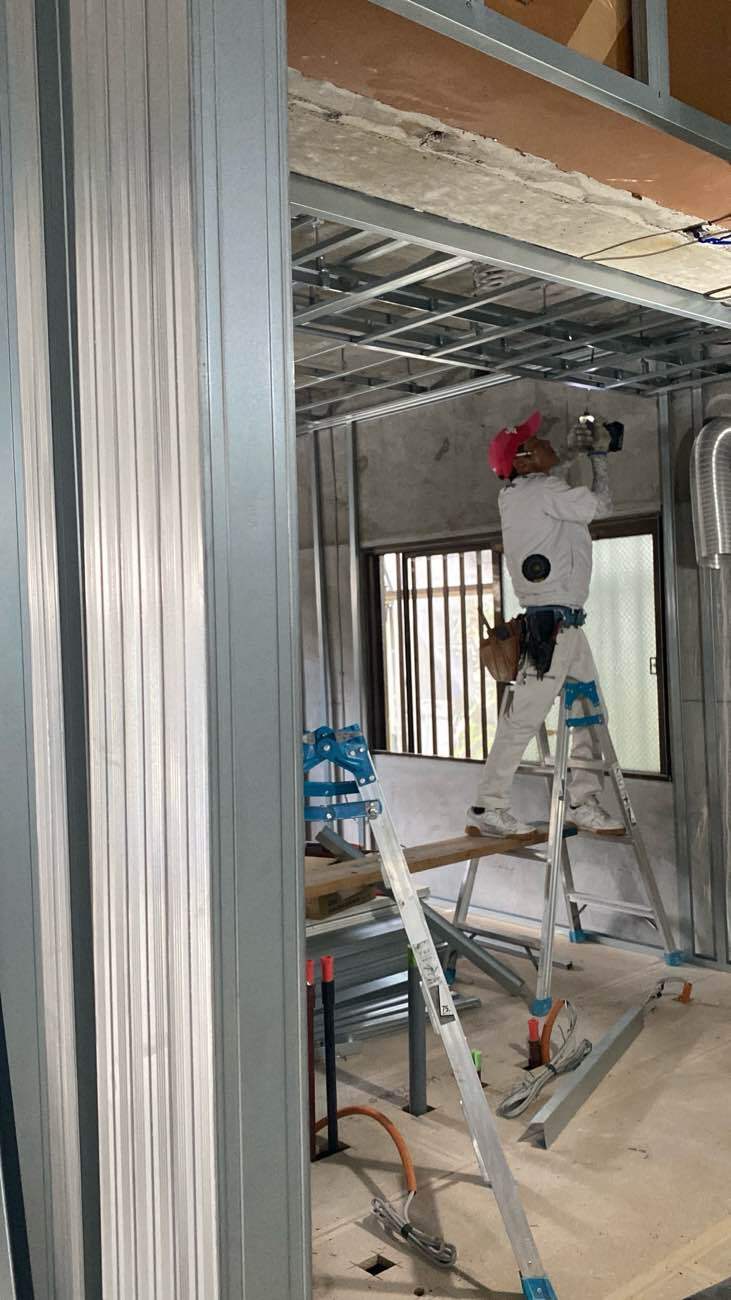 そこから現在は、間取りに合わせて軽量鉄骨で壁のベースが立ち上がり始めています! (写真は取付の様子) 新しい空間の変化が見えてきて、これからの仕上がりがますます楽しみです☺