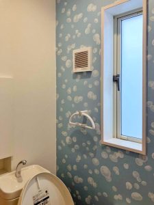 せっかくの機会を活かし、リビングの一面とトイレには、施主さまご家族のお好みに合わせた色やデザインの入った壁紙を選んでいただいて取り入れました。