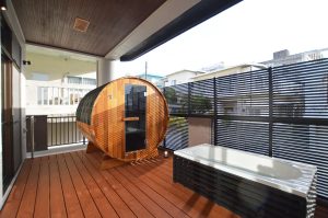 さらに、外のバルコニーにはウッドデッキを敷いてサウナも設置。